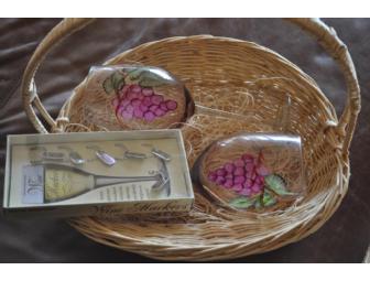 2 Hand Painted wine glasses with a grape motif, one package of wine charms and one bottle Abstract 2010 California red wine