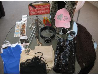 Feather headdress $15. Faux fur leopartd print vest, size large. Brown knit fringe vest size large. Black sequined tube top. Pink ball cap. Painted wooden wall art. One pair white with red "Hot Kiss" sunglasses. Black belt, size small. Chain necklace $14. Multi chain necklace. One pair feather earrings. One rope and leather necklace. One pair elastic "Brastrap" Combined value more than $200