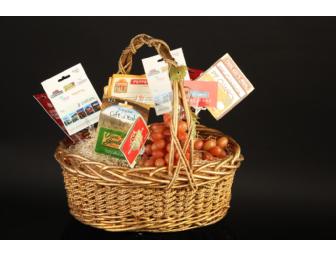 Basket containing Gift cards from: Red Lobster $10, $10, $30, TGIFridays $10, $10, Olive Garden $25, PF Changs $25, Honey Baked Ham $35, Chilis 4 free kids with purchase of adult