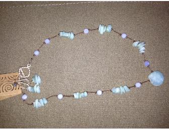Handcrafted Jewelry by Lilla Pia "Mint Chip" - Light Aqua & Pearly Blue beads on brown cord with sterling. All sets made with semi-precious stones, including amethyst, agate, blue lace agate, etc.