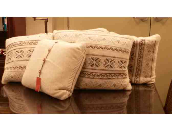 This five-piece alpaca wool pillow set is just the perfect fit for the family room couch or living room chairs. Stylish with its two toned pattern and button embellishments this set is perfect for curling up on the couch on a cold and rainy evening, yet chic enough to be the focal pieces for any new interior décor design.