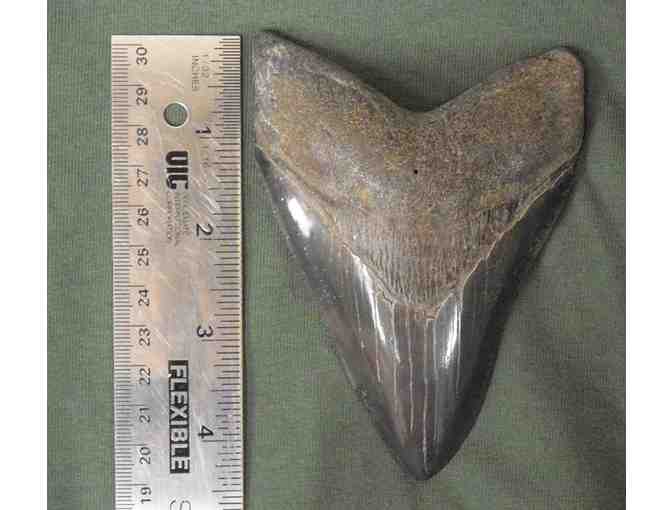 This actual Megalodon Shark Tooth from Steve's Fossil Shark Teeth is shown to scale in the picture. It is over 4 inches long. The tooth is approximately 3-7 million years old. A fossil this rare is certainly a collectors item for anyone interested in fishing or fossils!