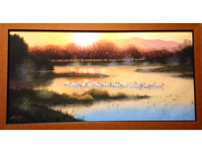 Signed and framed limited print on canvas by Andrew Annenberg. The printed it titled "Pelican Dawn".