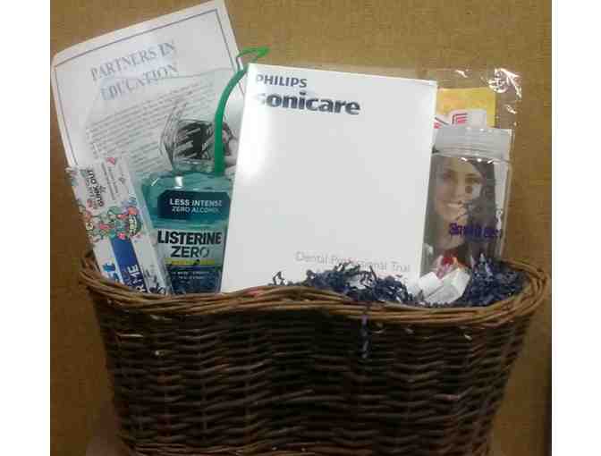 In this gift basket you will find Phillips Sonicare electric toothbrush - series 2 for plaque control, listerne, and a variety of hygenie products!