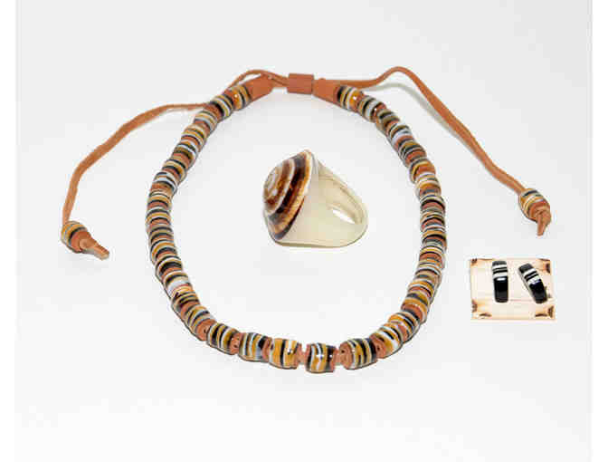 Glass beaded necklace, seashell ring and earrings - Handmade in Cuba