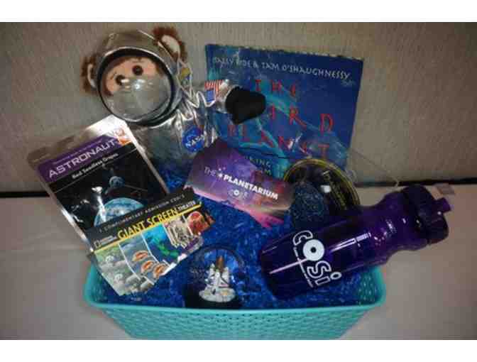 Enjoy four Planetarium passes with general admission and four National Geographic Giant Screen Theater passes. The gift basket also includes a COSI water bottle, spaceship COSI snow globe, the book The Third Planet, a stuffed NASA monkey, red seedless grapes space food, and The Miller Planisphere