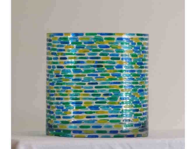 Hand painted with Crystal Gloss Enamels in Dark Blue, Turquoise, Green and Yellow. Measures 6 inches across the top and is 6 inches tall. Shines like stained glass with natural light or with a lit candle.