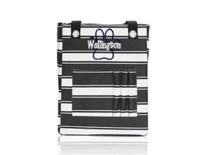 Show your school pride with a Tall Organizing Tote in navy and white, embroidered with a paw print and "Wellington" from thirty-one gifts. You’ll be amazed at how much this classic tote can hold. This tote features a zip-top closure, three exterior pen/pencil slots, one exterior flat pocket, one interior flat pocket, and one interior zipper pocket. Use it to keep your closet in order, carry toys or groceries while you’re on the go, haul camping gear and so much more.