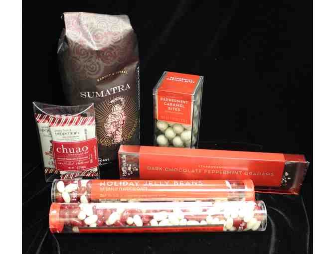 Pound of coffee, Holiday Candy, Peppermint Caramel Bites, Hand-crafted Chocolate, Peppermint Grahams and Jelly Beans.