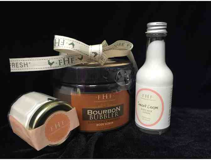 This basket includes FarmHouse Fresh Burbon Bubbler Scrob, FHF Sweet Cream & Whoopie Cream body creams.