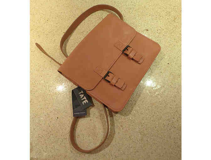 Designed by Barbara Wiggins for the Tate, UK, this handmade small school book satchel is in natural leather. Size: 9 1/2" high, 11" wide and 2" deep, with a long strap. Two buckles on the front, and a pocket sleeve on the back. Very light brown color, and it is new with tag.