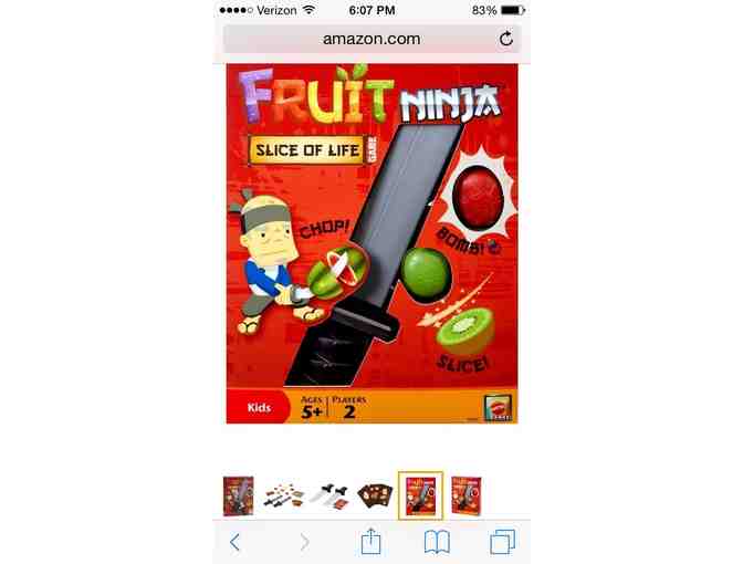 Fruit Ninja: Slice of Life Game - Based on the top-selling Apple iOS and Android app, the Fruit Ninja Slide of Life action game turns the fun of the digital app into fast and frenetic physical play. Both kids and adults alike love the app's addictive action of chopping and slicing flying fruit while avoiding the bombs, and now they can do it for real on either the table top or the floor. With two toy ninja swords, 20 physical fruit and bomb pieces, and 40 Fruit Ninja mission cards, this exciting skill and action game allows players to race to physically slash and splatter fruit pieces like true ninja warriors. Fruit Ninja Slice of Life is a two-player game in which the object of the game is to be the first player to complete each fruit mission card and earn the accompanying points. The player with the most points wins and is dubbed the ultimate Fruit Ninja.