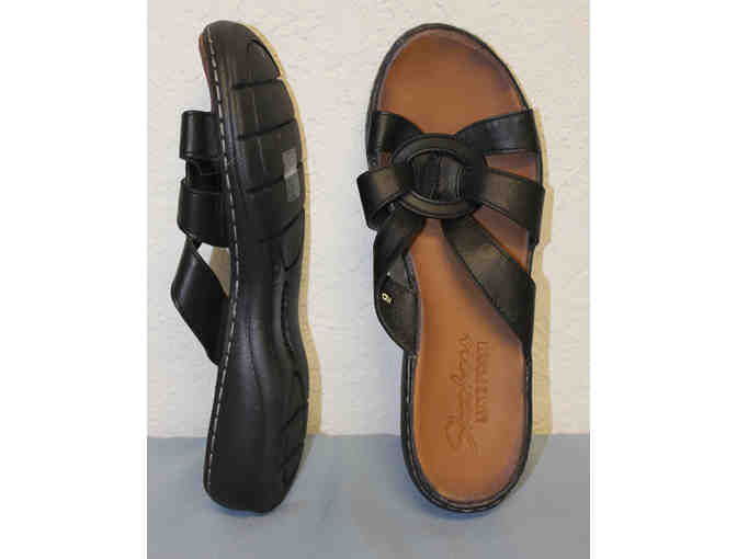 Smooth leather upper in a strappy casual comfort slide with stitching details.