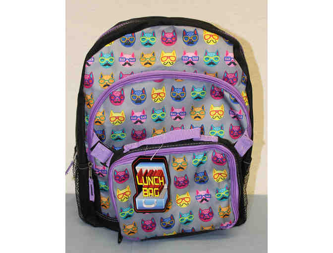 Colorful cats with glasses and moustaches on a gray background. There is a large zip compartment and an exterior zip pocket, plus 2 mesh side pouches. Adjustable/padded straps.