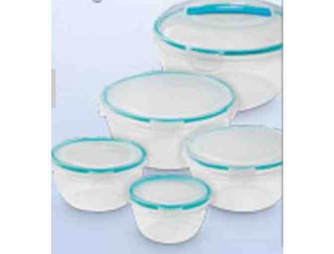 Snapware 10-piece set includes 1.16-cup, 2.62-cup, 5.61-cup, 10.7-cup, and 16.9-cup containers with matching spillproof lids.