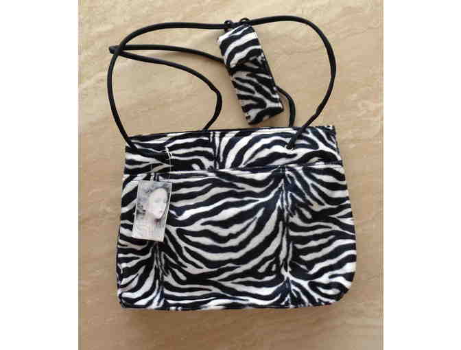 New Zebra Design Tote-Style Handbag. Double zippered compartment handbag. Inner zippered pocket in one compartment. Outer deep pocket with velcro closure. Extra eyeglass holder feature on the handle. Faux fur has a defect along one top edge (see picture). Strap drop is 13". Measures 13" x 10.5" x 3".