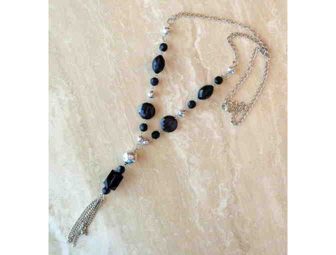 Black acrylic & silver shapes on a 30" necklace with a 6" drop tassel. Clasp closure.