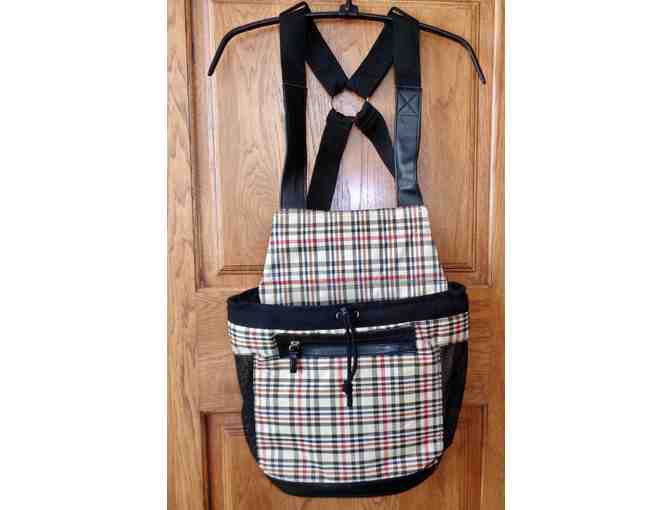 Comfortable, fashionable & secure. Holds up to 12 lbs, Adjustable straps, outer zippered pocket, inner zippered pocket, side mesh ventilation, snap to hook on pet's collar, removable carpet, & bottom studs. Measure 10" x 11" x 6". Perfect condition. Made by FiFi of 5th Avenue.