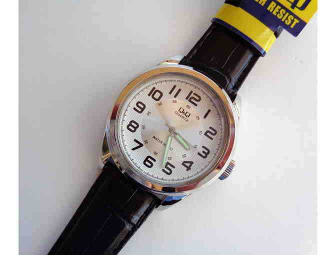 Quartz watch, stainless steel back, black synthetic leather strap, 3 bar water resistant. Fits up to a 9" wrist. Water resistant. Made by Q&Q.