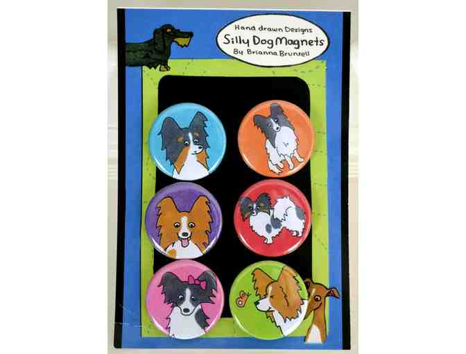 Set of Six 1.25 inch round beautiful Papillon Silly Dog Magnets by Artist, Briana Lennox. They are mounted on a super bright and fun display card. Per the Artist's words: "This set is very exciting to me because it reminds me of my awesome grandmother and her best friend - a Papillon named Andre Amore."