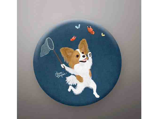 Papillon Butterfly Dog Fridge Magnet. Has a Papillon dog chasing butterflies on round blue background. Put a smile on your fridge with a Panting Portrait Magnet!