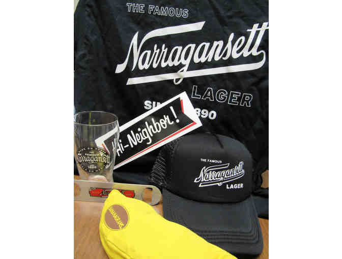 You are bidding on some great items from Rhode Island's own Narragansett Beer. The gift pack includes a t-shirt (size medium), a trucker's hat, a bottle opener, a beer glass, five bumperstickers, and as a bonus another Rhode Island-made product - the Bananagrams word game!