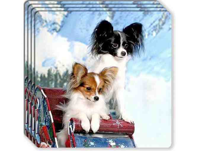 Brighten up your home or office with this versatile set of 4 Coasters featuring 2 Papillons on a sled! Neoprene rubber backing. Measure 3.5" x 3.5" x 1/4". Non-skid and machine washable. Perfect for parties, picnics, morning coffee, everyday use even as a small trivet. Packaged in clear box, making them the perfect gift