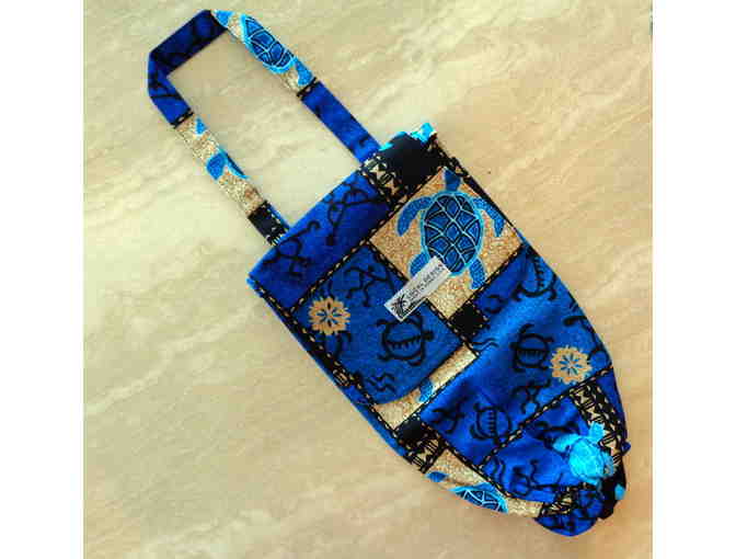 Don't know what to do with your leftover grocery bags? Use this handy bag holder. Heavy duty cotton turtle print in blues, gold, & purple. Put the bag in the top and pull them out at the bottom. Has flap at the top. Measures 16" long with a 7" drop for the handle. Sewn with heavy duty cotton fabric. See our matching apron made from the same fabric listed on Auction as Item 167. Made by Local Designs in Hawaii.