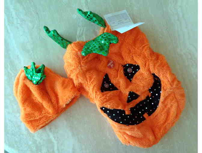 Adorable pumpkin costume for your pet. Press button on the back and the eyes light up and blink. Measures 14"-18" neck, 14"-17" back length, 21"-25" girth. Too cute! Modeled by Sasha!