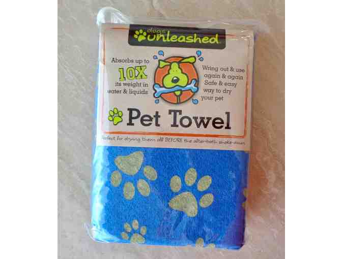 New Super Absorbent Pet Towel with black paw prints on royal blue background. Absorbs up to 10 times its weight in water & liquids. Wring out & use again & again. Safe & easy way to dry your pet. 100% viscose. Measures 20" x 27". Machine washable & lay flat to dry. Made by Dogs Unleashed.