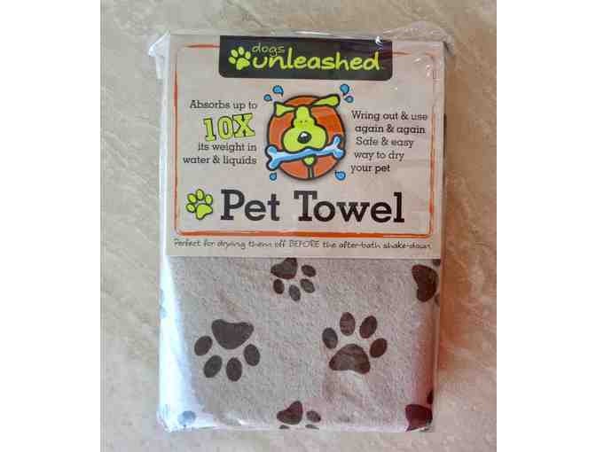 New Super Absorbent Pet Towel with black paw prints on tan background. Absorbs up to 10 times its weight in water & liquids. Wring out & use again & again. Safe & easy way to dry your pet. 100% viscose. Measures 20" x 27". Machine washable & lay flat to dry. Made by Dogs Unleashed.