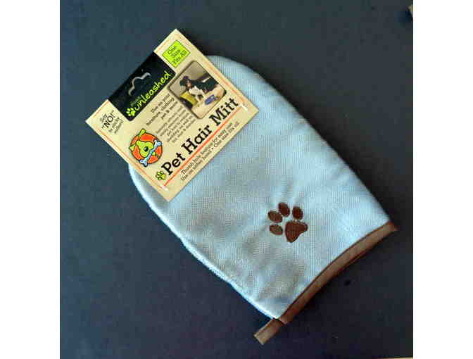 Blue pet hair mitt. Use on your furniture, clothing, pet & more. Instantly attracts and easily removes loose pet hair to reduce shedding, as well as lint, dust & dander. Has thumb hold feature for easy use on either hand. One size fits all. Made by Dogs Unleashed.