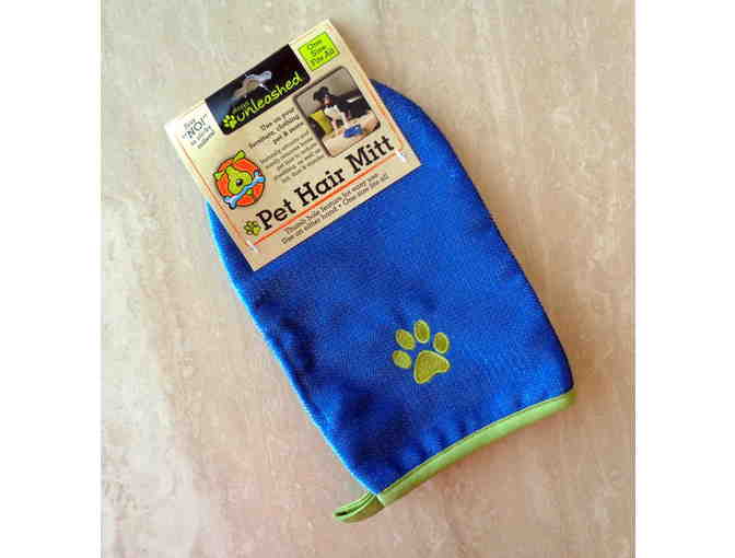 Royal blue pet hair mitt. Use on your furniture, clothing, pet & more. Instantly attracts and easily removes loose pet hair to reduce shedding, as well as lint, dust & dander. Has thumb hold feature for easy use on either hand. One size fits all. Made by Dogs Unleashed.
