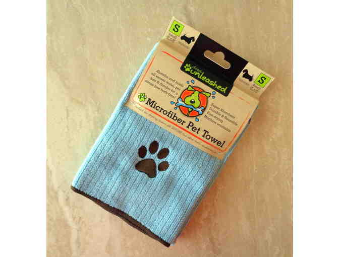New blue with black edging Microfiber Pet Towel. Has single black paw print. Absorbs and holds all excess water, pet hair & dander for a stress-free bath time. Super absorbent, durable & reusable, fast-drying, machine washable. 100% polyester. Size small, measures 18" x 28". Made by Dogs Unleashed.