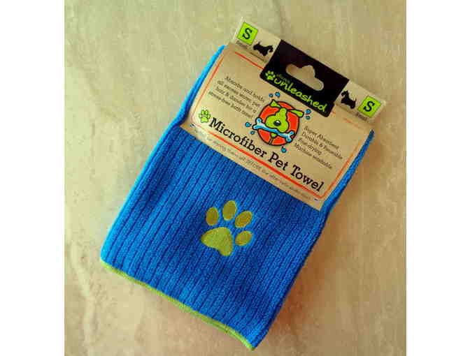 New royal blue with lime green edging Microfiber Pet Towel. Has single lime green paw print. Absorbs and holds all excess water, pet hair & dander for a stress-free bath time. Super absorbent, durable & reusable, fast-drying, machine washable. 100% polyester. Size small, measures 18" x 28". Made by Dogs Unleashed.