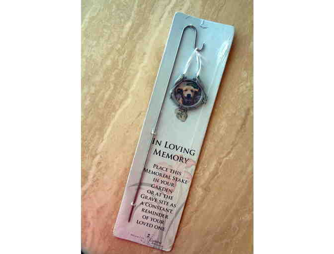 Place this memorial stake in your garden or at the grave site as a constant reminder of your loved one. Insert your pet's photograph in the hanging medallion, which says, "In Loving Memory" "God bless this dog." Measures 16" tall. Made by Cathedral Art.