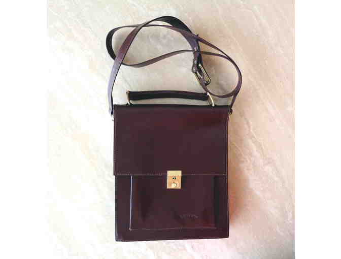 Fabulous hand- or adjustable cross-body travel bag. Has many compartments all in a beautiful cordovan color. Cordovan is a rich shade of burgundy. Its name comes from the city of Cordoba, Spain, where the production of shell cordovan leather was first practiced by the Visigoths in the 7th century.