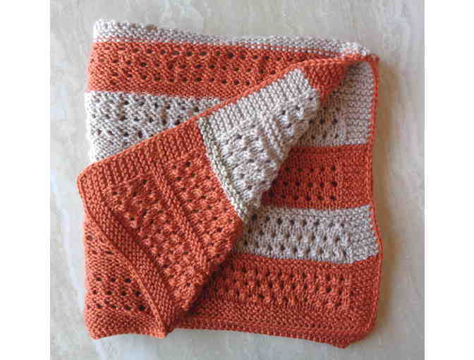 Keep warm this winter! Lap robe hand-knit especially for Pap 911 by Gloria (90 years old). Wide burnt orange & tan stripes. Measures 32" x 56". Beautiful workmanship! Great baby shower gift!