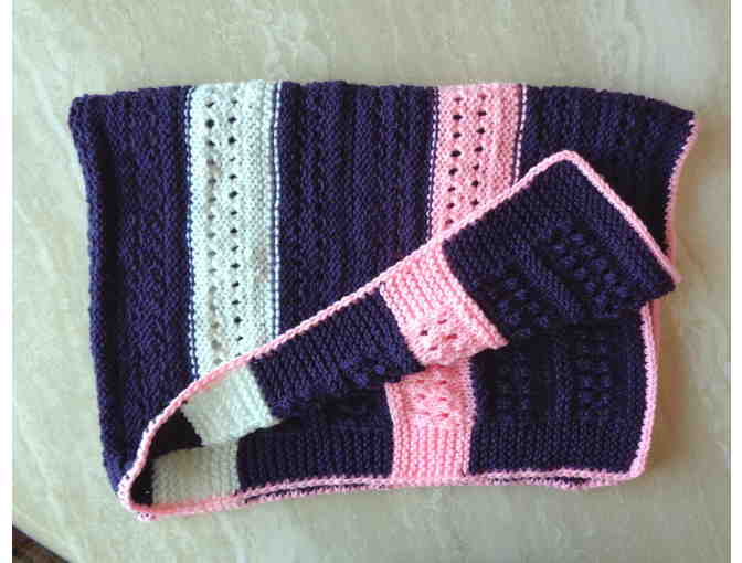 Keep warm this winter! Lap robe hand-knit especially for Pap 911 by Gloria (90 years old). Wide purple/white/pink stripes. Measures 40" x 48". Beautiful workmanship! Would also make great baby shower gift!