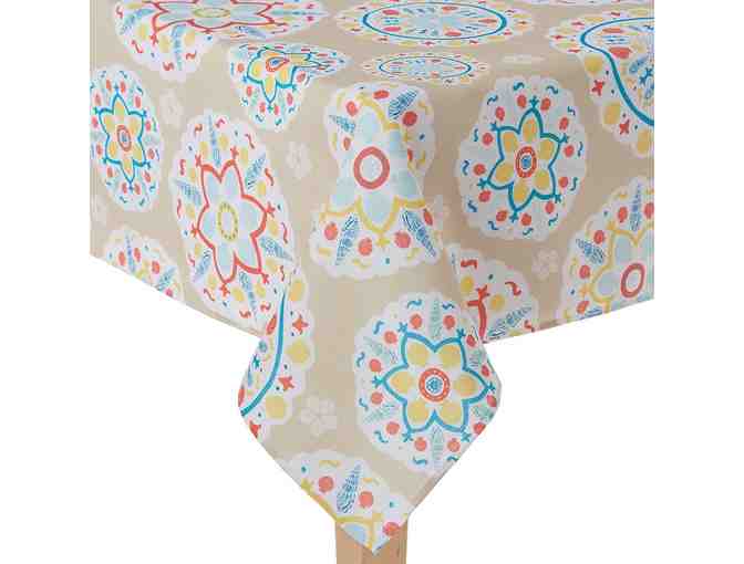 Stylish tablecloth from Celebrate Local Life Together. Medallion print creates a stunning look. Polyester. Machine wash. Measures 60" x 102". Check out matching set of 4 napkins listed on Auction as Item 226.