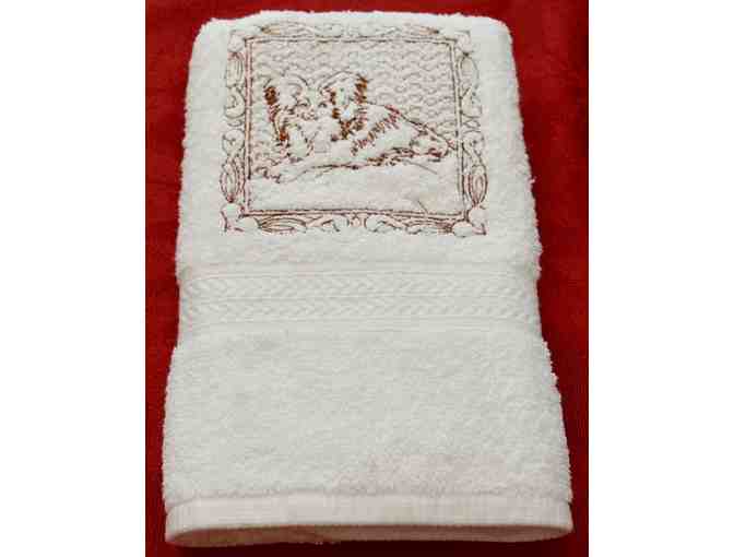 Detailed Embroidered laying Papillon design in dark brown on a white hand towel.   Embroidered design measures approximately 4.5" x 4.5". Hand towel measure 16 x 30 inches. Quality design and towel!