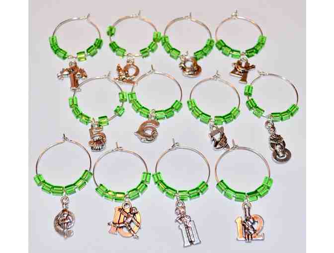 Cute wine glass charms featuring the 12 Days of Christmas theme. Each Charm has an antiqued silver-tone charm with 6 green beads on either side. Ring measures approximate 1" diameter. Fun gift or for use at Christmas dinner or party.