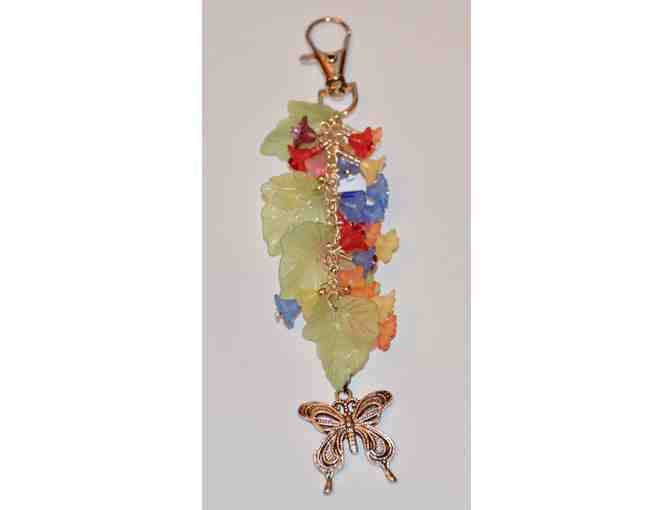 Handbag Charm constructed of colorful lucite flowers and leaves accented with beads and a large gold-tone butterfly charm. Has clasp for attaching to bag. Measures 5.75" in length including clasp and the Butterfly Charm measures .75" W x 1" L. Very cute!