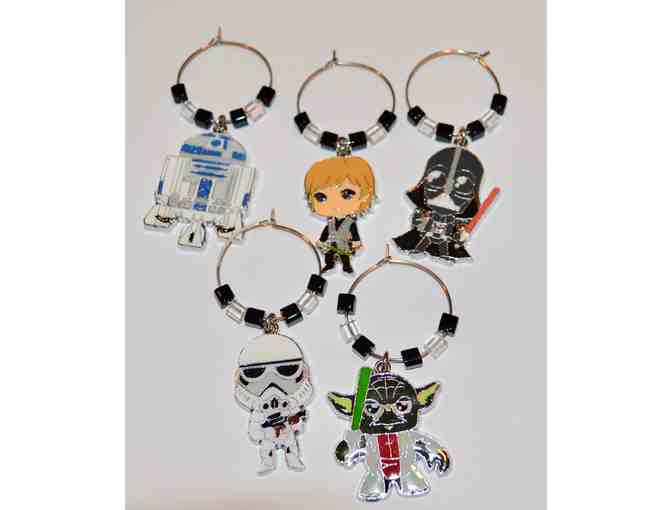 Cute set of 5 Star Wars themed wine glass charms. Feature a storm trooper, Darth Vader, Yoda, R2D2 & Jyn figures with bead accents. Measures Great gift for your Star Wars' Fan or just for you!