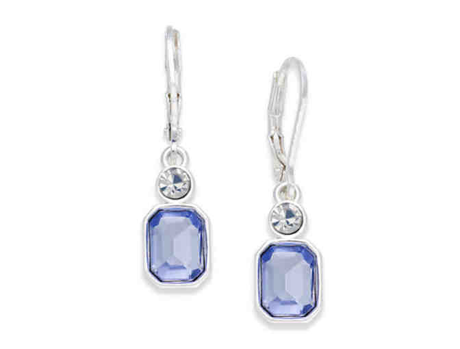 Achieve fashion lift-off with the gorgeous sky-blue of these stone drop earrings from Anne Klein in silver-tone. Has rectangular blue stone under a round clear crystal. Approximate drop: 5/8". Has lever backs. Comes in gift box.
