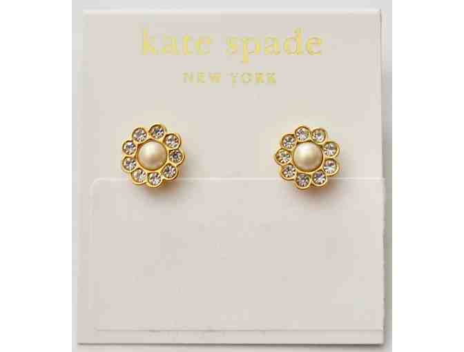Pretty pair of Kate Spade "Park Avenue Flower" stud earrings. Petals have clear crystals surrounding a cream round pearl at center. Measures .25" diameter. Very nice pair of earrings!