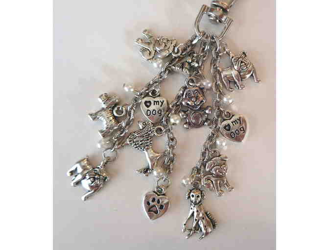 Dogs, dogs, dogs. It’s all about your doggie dangling bag charms. Silver-tone dogs interspersed with small pearls. Each fish Chains measure 1”. Chains measure 3” not including the swivel lobster claw clip.