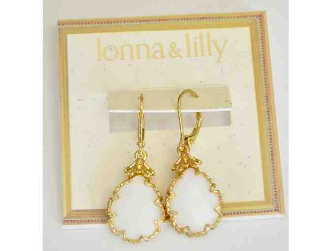 White faux mother of pearl pear-shaped stones add delightful style to these lonna & lilly drop earrings, designed in scalloped gold-tone. Approximate drop: 1”. Has lever back closures. Comes in gift box. Very pretty!