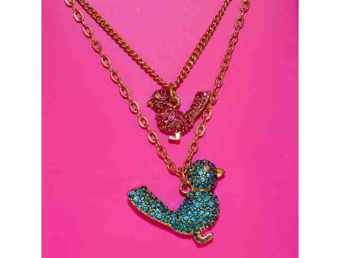 Tweet and twitter about this fabulous pink and blue pavé bird layered pendant necklace fashioned by Betsey Johnson in gold-tone. Approximate chain length is 16" + 3" extender. Approximate drop: 1-3/4”. Comes in gift box. Adorable gift for anyone.
