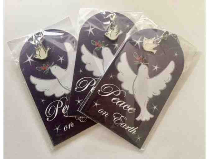 Set if 3. Decorate holiday gifts with a wish for peace that bears with it a gift of its very own -- a dainty peace dove charm to attach to zipper, purse, bracelet, and beyond! Plastic with silver-tone & enamel charm. Measures 3.5" H x 2" W (8.9 x 5.1 cm).